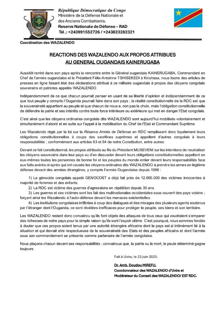 Haribazwa uburyo Muhoozi azarwanya Wazalendo mu gihe , ingabo za Fardc zifatanya n’uyu mutwe kurwanya inyeshyamba za m23 m’uburasirazuba bwa RDC Kandi uyu mutwe ukaba ushimagizwa n’ubutegetsi bwa Tshisekedi amankwa n’ijoro Kandi abategetsi barimo na perezida Tshisekedi banawoherereza ibikoresho n’amafaranga.