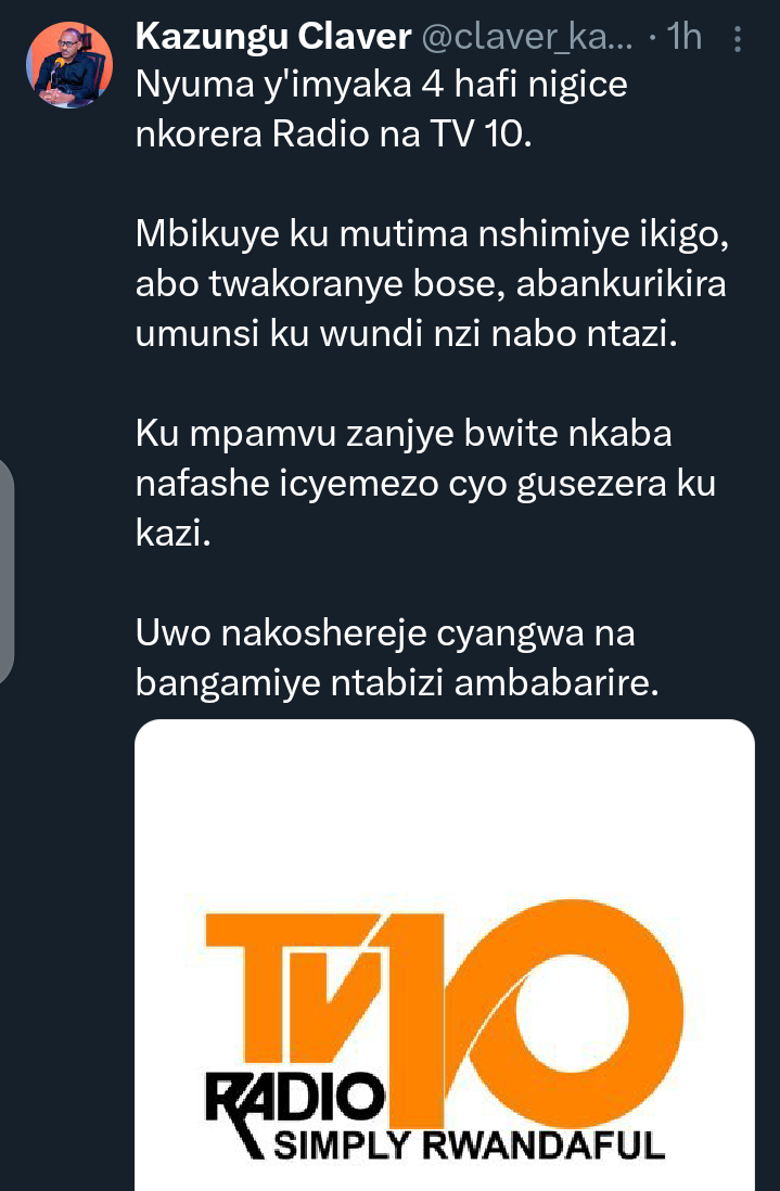 yagize ati:”Nyuma y’imyaka 4 hafi nigice nkorera Radio na TV 10. mbikuye ku mutima nshimiye ikigo, abo twakoranye bose, abankurikira umunsi ku wundi nzi nabo ntazi. Ku mpamvu zanjye bwite nkaba nafashe icyemezo cyo gusezera ku kazi. Uwo nakoshereje cyangwa na bangamiye ntabizi ambabarire”.