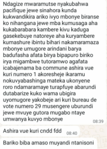 Hari uwamwandikiye amubwira ko yatoreye ku rya mbere ku mashuri, ibiro by’itora nimero 29, ko ibintu yahabonye biteye agahinda, akaba yabonye umugore mu kazu k’itora bamwe bafasha abatora, uwo mugore afata ibipapuro biriho amashyaka, ashyiraho ko abantu batoye akoresheje ikaramu kuri nimero ya mbere (CNDD-FDD).